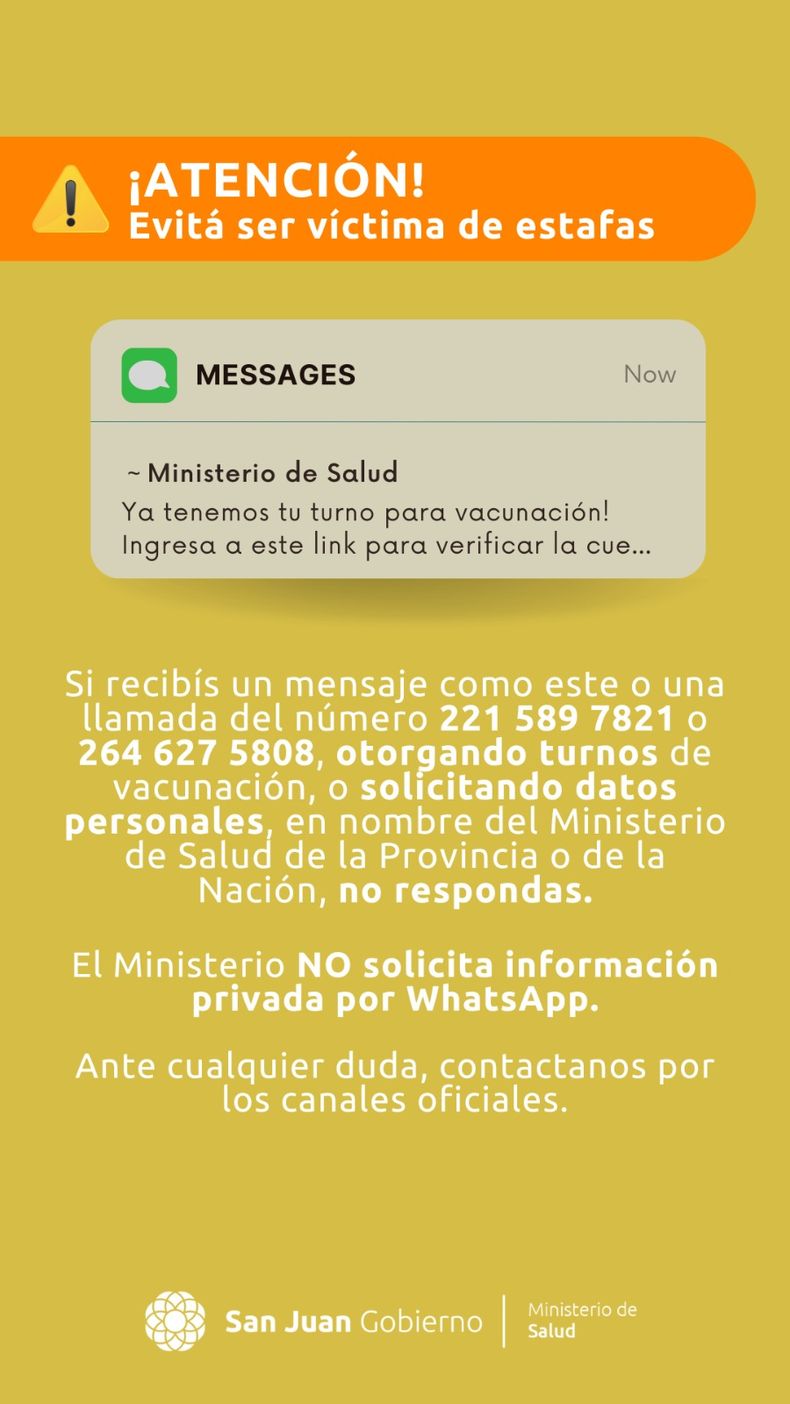 Alertan por estafas de un número que se hace pasar por el Ministerio de Salud en San Juan