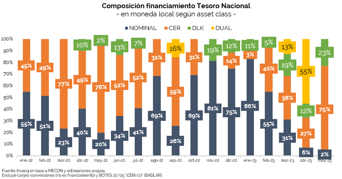 Por otro lado, el aumento en los plazos de colocación viene acompañado de un incremento en la indexación de la deuda. De hecho, como remarcan desde Invecq, durante mayo, el 98% del financiamiento neto obtenido provino de la emisión de títulos indexados, siendo el porcentaje más alto desde abril, cuando fue del 94%. En detalle, el 75% de lo colocado está ligado al índice CER (Coeficiente de Estabilización de Referencia) -la mayor proporción desde mayo de 2022-, el 23% está vinculado a la evolución del dólar y solamente el 2% corresponde a la emisión de la letra LELITE, suscrita por Fondos Comunes de Inversión, cuya Tasa Efectiva Anual (TEA) ha aumentado significativamente a 139,3% (en comparación con el 107,8% de abril).