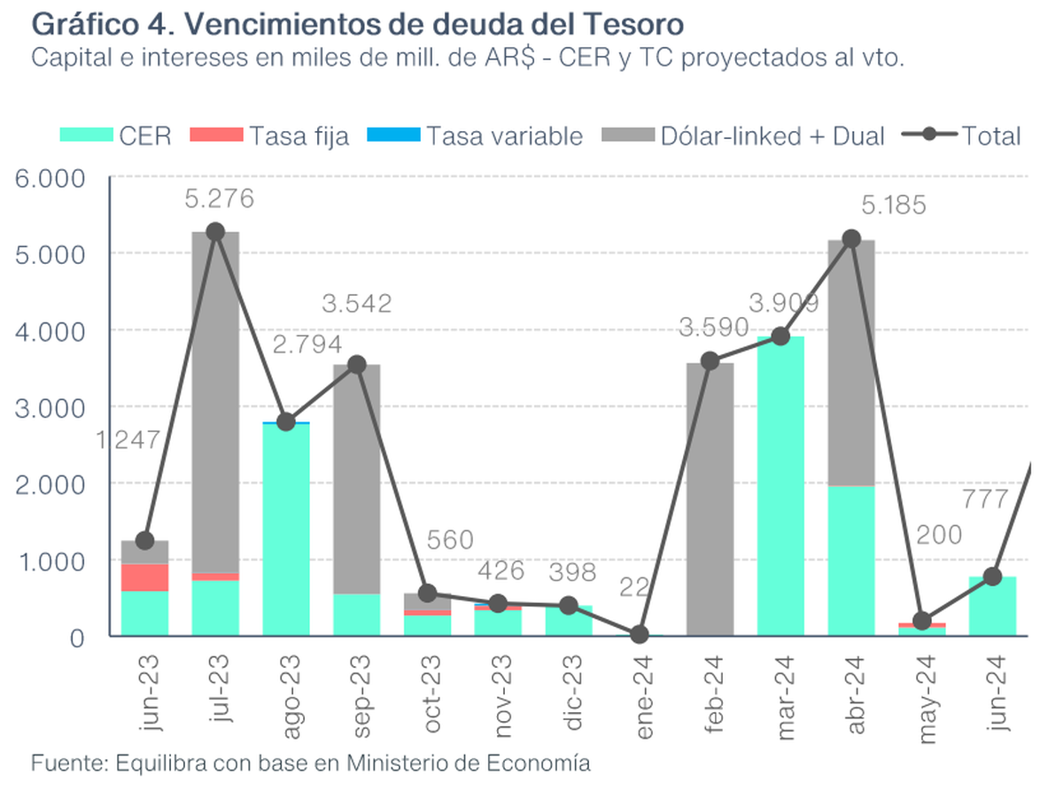 Lo esperable es que el Gobierno continúe aplicando la estrategia que ha seguido en los últimos meses, que consiste en refinanciar los vencimientos de corto plazo a través de canjes, como lo hizo en enero y marzo. También buscará extender los plazos emitiendo instrumentos financieros indexados. En relación a esto, se ha informado que el equipo económico ha iniciado conversaciones con los bancos para llevar a cabo un nuevo canje y postergar los compromisos que corresponden a los meses de junio a agosto.