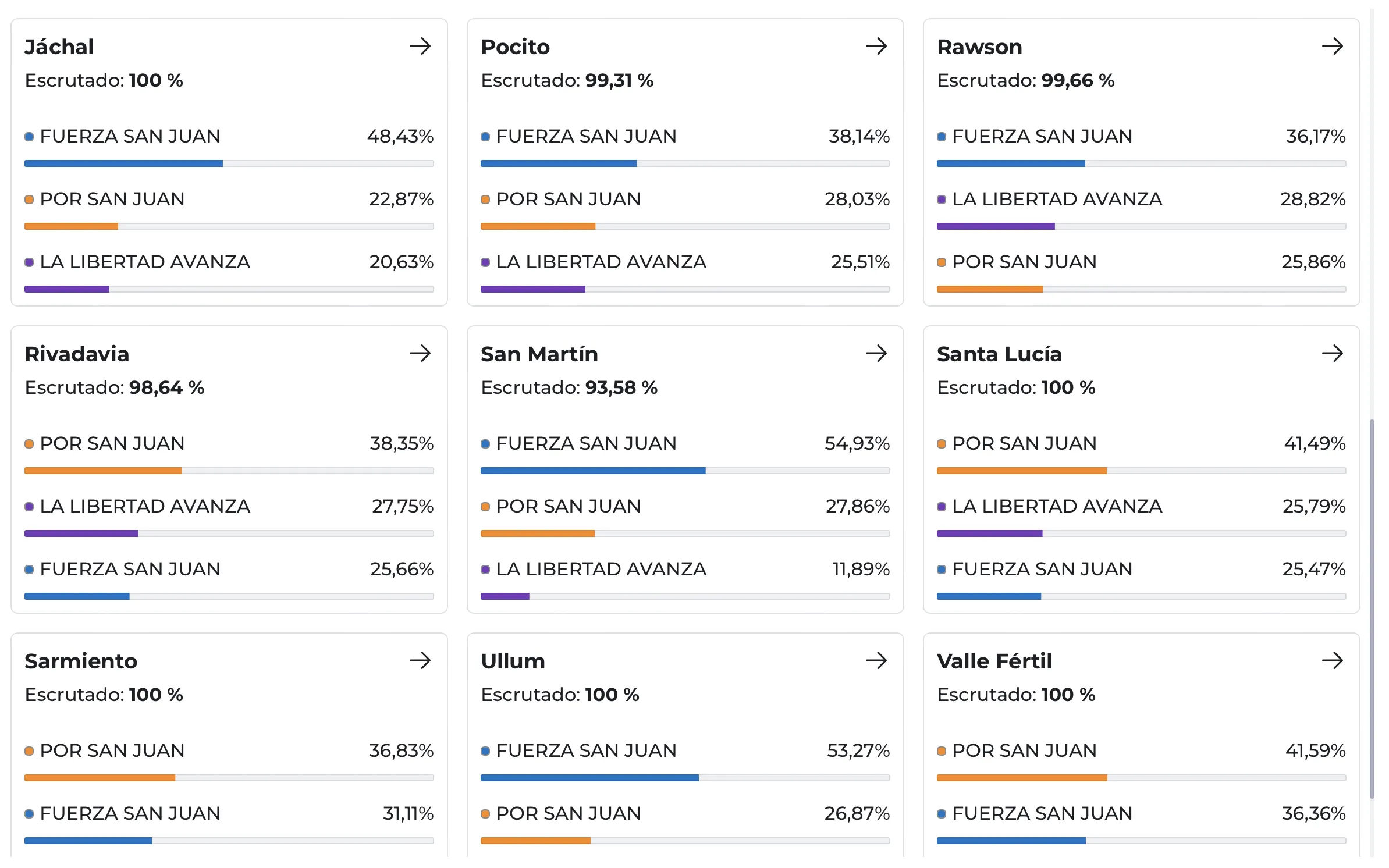 Por su parte, Fuerza San Juan obtuvo triunfos en 12 localidades, consolidando su peso en el Gran San Juan. Los mayores porcentajes se registraron en San Martín (54,93%), Chimbas (44,42%), Rawson (36,17%) y Pocito (38,20%), donde el espacio justicialista contó con el apoyo de los intendentes Fabián Gramajo y Carlos Munisaga. En la periferia, también ganó en Angaco (43,49%), Albardón (39,25%) y Ullum (53,27%).