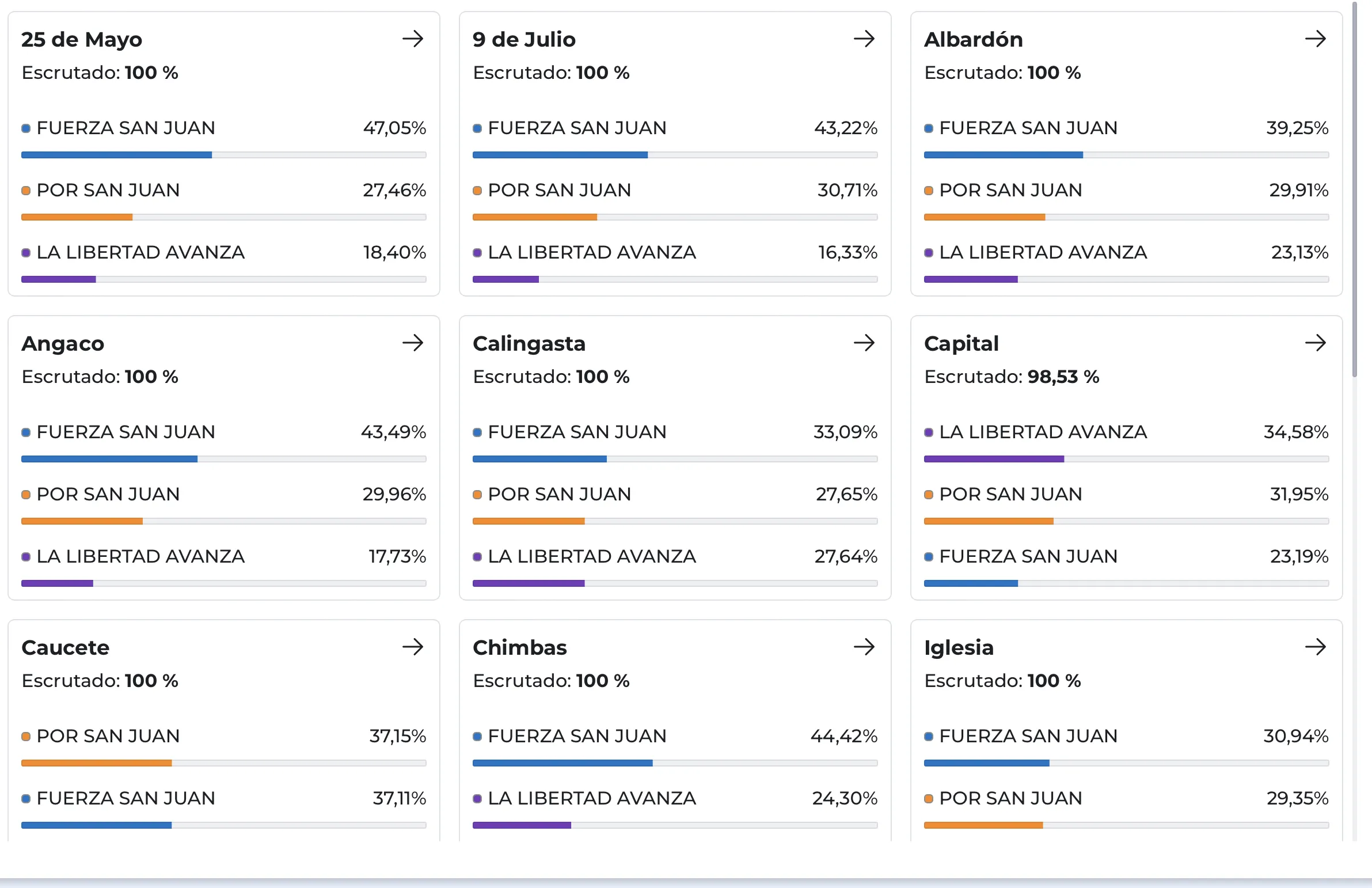 En los departamentos más alejados del centro provincial, el PJ mantuvo victorias en 25 de Mayo (47,05%), Jáchal (48,43%) y Calingasta (33,09%), mientras que en Iglesia, gobernado por el bloquista Jorge Espejo, alcanzó 30,94%.