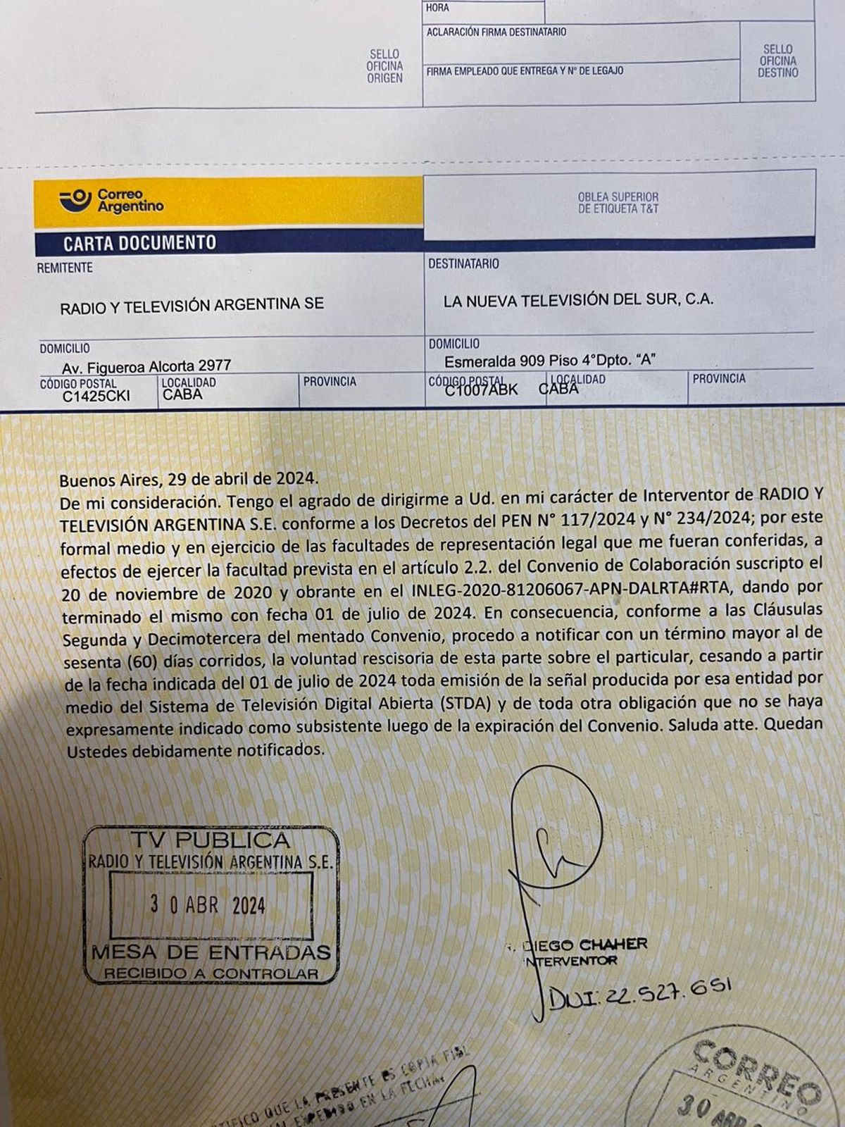 Lleva la firma del interventor de la radio y televisión argentina, el abogado mendocino Diego Chaher, e indica que conforme a dos decretos del 2024, el 117 y el 234, y en ejercicio de su rol, procede a informar la voluntad rescisoria y ordena el cese de la emisión del canal por la Televisión Digital Abierta a partir de julio.