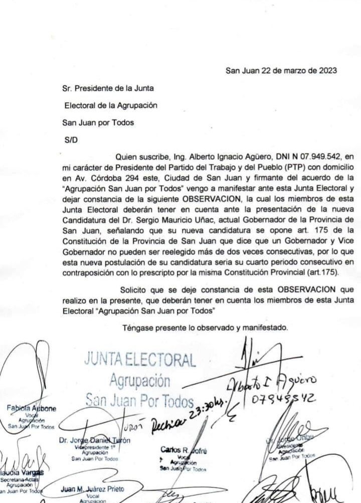 El pedido fue firmado por el presidente del Partido de los Trabajadores y el Pueblo, Alberto Agüero, quien fundamenta su impugnación en el artículo 175 de la Constitución Provincial afirmando que, en el texto, una misma persona no puede ser reelecto más de dos veces.