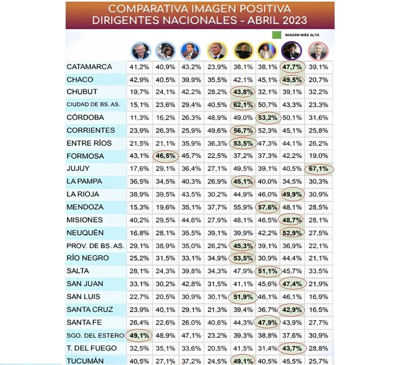 Cristina Kirchner, Alberto Fernández, y Gerardo Morales lideran en una provincia cada uno: Formosa, Santiago del Estero, y Jujuy, respectivamente. Macri termina invicto de la peor manera, sin ninguna provincia en la que su imagen supere a la de los demás dirigentes.