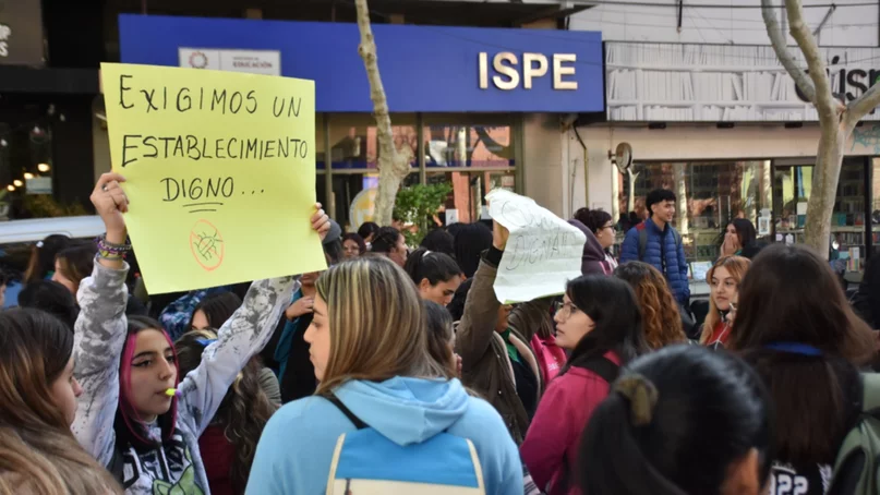 Este viernes por la mañana los alumnos del Instituto Superior de Formación Docente (ISPE) se manifestaron frente a la institución ubicada en calle Rivadavia, frente a la Catedral, reclamando por el mal estado edilicio de las instalaciones y el aumento sorpresivo del 36% en la cuota que deben pagar.