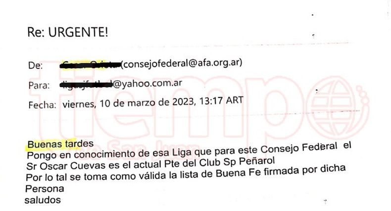 “El señor Oscar Cuevas es el actual presidente del Club Sportivo Peñarol. Por lo tal se toma como válida la lista de buena fe firmada por dicha persona”, expuso el Consejo Federal en un mail que llegó en horas de la siesta al correo de la Liga Sanjuanina de Fútbol. Esto significa que los documentos y contratos que entregó la Comisión Directiva, enemistada con Cuevas, no tiene validez: tanto Salvador Mónaco como el resto de los jugadores (son 43, pero la mitad había llegado como refuerzos y de otras provincias) quedaron afuera de Peñarol.