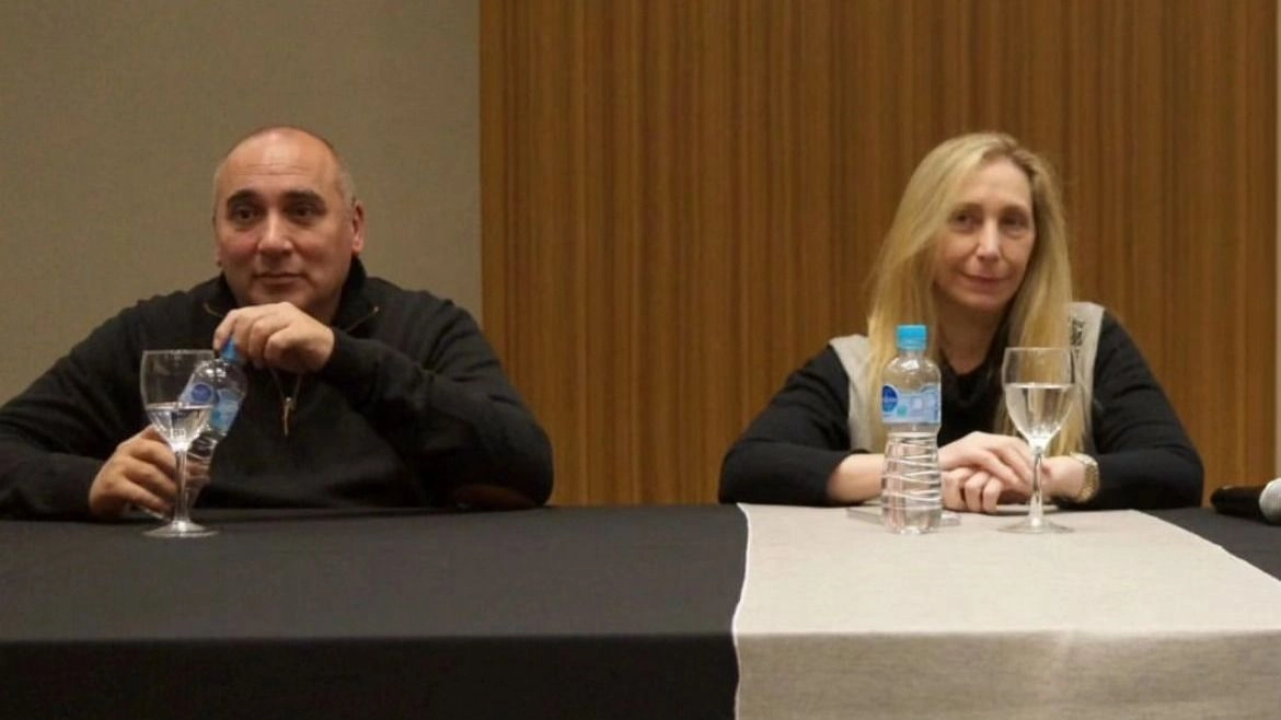 José Peluc con Karina Milei durante la conferencia que brindaron a los militantes.