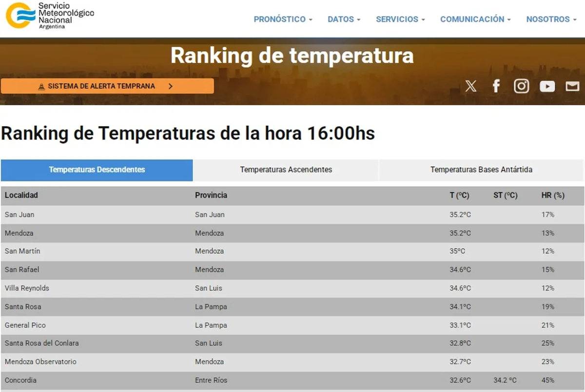 San Juan vivió una Navidad marcada por el calor extremo. Según el parte oficial de las 16:00 del Servicio Meteorológico Nacional (SMN), la capital provincial se ubicó como la ciudad más calurosa de la Argentina, con una temperatura de 35,2°C y una humedad relativa del 17%.