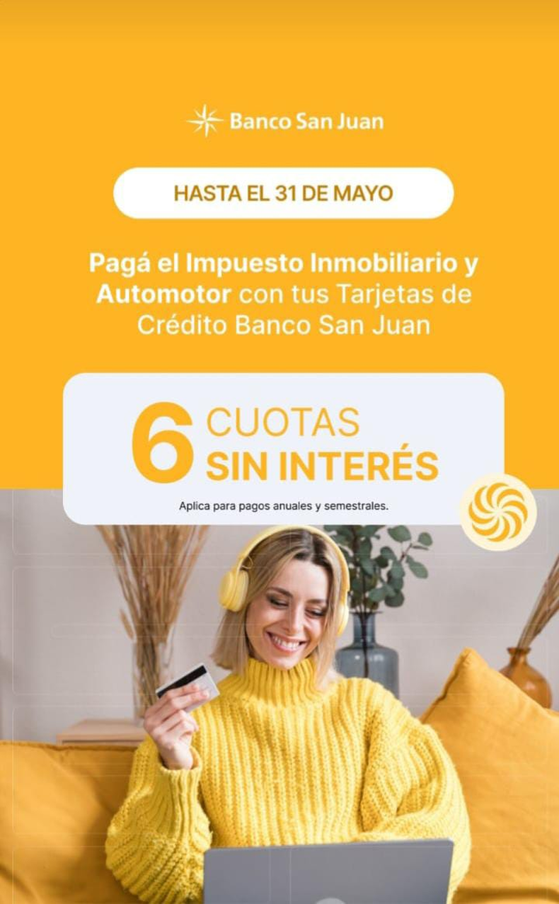 Se trata de un beneficio para aquellos sanjuaninos que posean tarjeta de crédito del banco San Juan que es el agente financiero de la provincia. Podrán pagar el vencimiento del pago anual o semestral del impuesto inmobiliario que se produce a fin de mes, en seis cuotas sin interés.