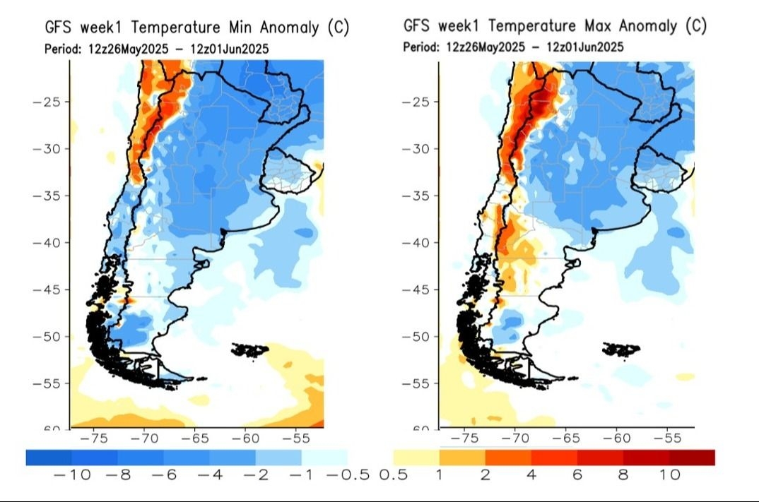 Anomalías de temperaturas mínimas (izquierda) y máximas (derecha) para la semana del 26 de mayo al 01 de junio.