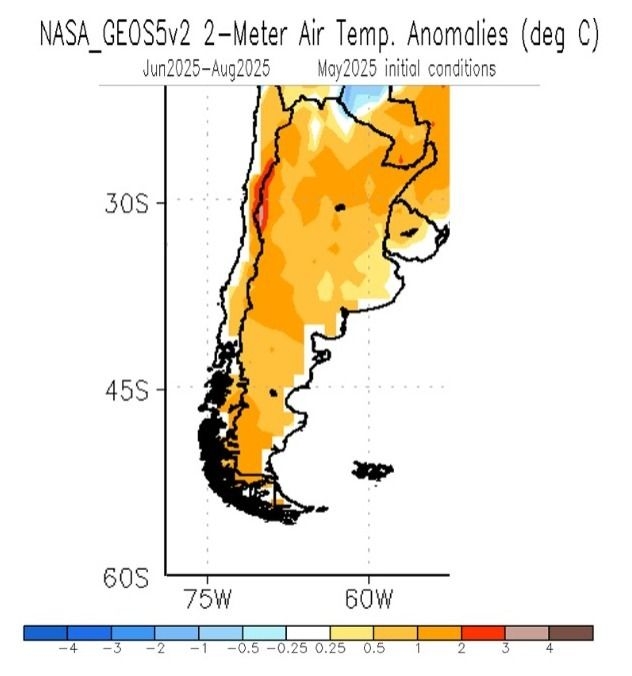 pronóstico de anomalías de temperatura para los meses de junio a agosto, teniendo en cuenta las condiciones iniciales del mes de mayo. D Huarpe