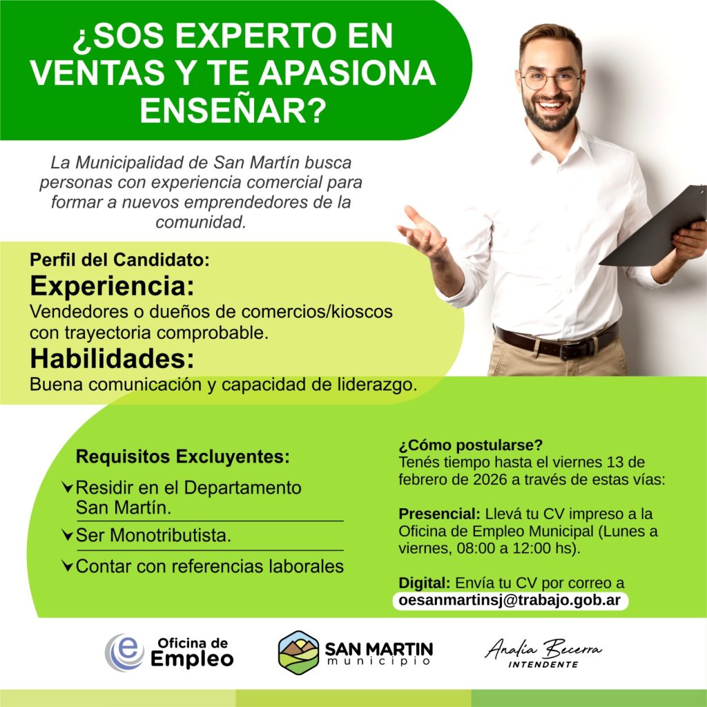 Desde el Municipio de San Martín se lanzó una nueva convocatoria orientada a sumar capacitadores en ventas, con el objetivo de continuar fortaleciendo a los emprendedores y proyectos productivos de la comunidad. La iniciativa busca perfiles con trayectoria comercial, habilidades de comunicación y vocación para la enseñanza.